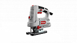 Мощность 850 Вт. Глубина реза сталь/дерево 10-100 мм. Производительность 800–3000 ходов пилки в минуту. Вес – 2,4 кг. Рукоятка с прорезиненной поверхностью.  Эта модель лобзика оснащена: Функция плавного пуска, регулируемая металлическая подошва и кнопка фиксации выключателя, лазерный указатель направления, подсветка, быстросъемное крепление пилки, система маятникового хода, удобно вынесенный на ручку регулятор оборотов, возможность подключения пылесоса.