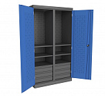 Шкаф инструментальный серии «PROFFI» предназначен для хранения оснастки, приспособлений и инструмента на рабочих местах в мастерских, цехах и других производственных зонах. Шкаф изготовлен из листовой стали и обеспечивает надежное запирание дверей ригельной системой. Шкаф содержит четыре ящика, одна перегородка и восемь полок. Размеры:(ВхШхГ) 1800x1000x500 мм. Масса: 71,4 кг. Нагрузка на полку – не более 100 кг. Нагрузка на перекладину - не более 15 кг. Суммарная нагрузка на шкаф не более 400 кг.