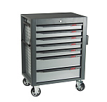 7 ящиков. Все ящики снабжены быстросъемными полозьями на роликах, полностью выдвигаются и легко вынимаются из тележки. Каждый ящик оборудован двумя индивидуальными фиксаторами, которые предотвращают произвольное открытие ящика во время передвижения тележки. Большая ручка способствует удобному перемещению во время работы. Центральный замок. Размеры ящика: 580х377х74 мм.