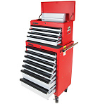 Тележка инструментальная 7 ящиков + ящик инструментальный 4 секции. Все ящики снабжены быстросъемными полозьями на роликах, полностью выдвигаются и легко вынимаются из тележки. Каждый ящик оборудован двумя индивидуальными фиксаторами, которые предотвращают произвольное открытие ящика во время передвижения тележки. Большая ручка способствует удобному перемещению во время работы.