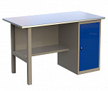 Однотумбовый. Допустимая нагрузка на столешницу 750 кг. Опорные элементы выполнены сварными из холоднокатаной стали. Верстак состоит из  опоры, тумбы P7 с дверью и двумя полками и полки-стенки. Все металлические элементы покрыты полиэфирной порошковой краской. Столешница состоит из фанеры марки ФСФ толщиной 24 мм, которая покрыта лаком-антисептиком и листом оцинкованной холоднокатаной стали толщиной 1,2 мм. Размеры (ВхШхГ) 855x1196x696 мм.