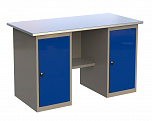 Верстак двухтумбовый поставляется в разобранном виде (4 элемента). Нагрузка на столешницу до 600 кг. Стандартный цвет: корпус - серый глянец RAL 7030, ящики и двери тумб - синий RAL 5017.  Размеры: 855x1400x700 мм. Масса: 78 кг.