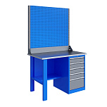 Однотумбовый. Допустимая нагрузка на столешницу 750 кг. Опорные элементы выполнены сварными из холоднокатаной стали. Верстак состоит из  опоры, тумбы P7 с дверью и двумя полками и полки-стенки. Все металлические элементы покрыты полиэфирной порошковой краской. Столешница состоит из фанеры марки ФСФ толщиной 24 мм, которая покрыта лаком-антисептиком и листом оцинкованной холоднокатаной стали толщиной 1,2 мм. Размеры (ВхШхГ) 855x1196x696 мм.