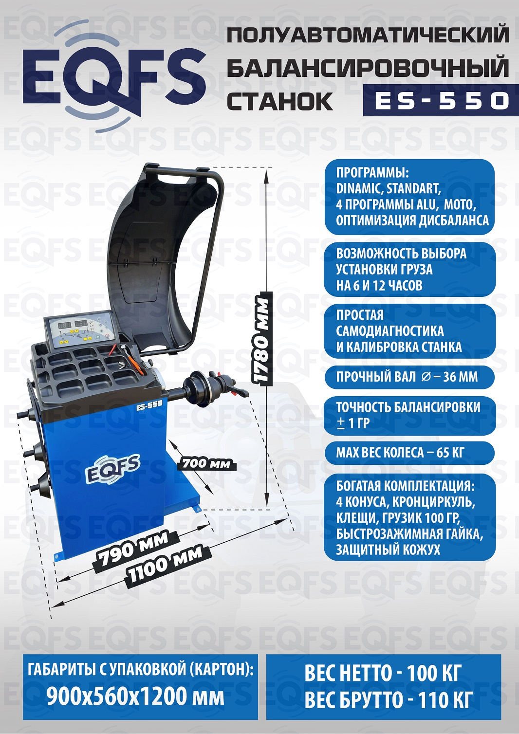 ES-550 Балансировочный станок. Полуавтомат. Удобный и понятный интерфейс. Автозапуск опусканием кожуха. Автоматический ввод дистанции и диаметра диска. Лазерная навигация. Автокалибровка. Для колес легковых автомобилей, мотоциклов, «Газелей», «Спринтеров» с диаметром диска с резиной до 800 мм. Размеры диска: ширина 3–10” (76-254 мм) , диаметр диска 10–24” (254÷609 мм). Вес ≤ 65 кг. Вал- 36 мм. Точность ±1гр. 220 В. Режимы работы DINAMIC, STATIC, ALU1, ALU2, ALU3, ALUS, ST. Гарантия 12 мес.