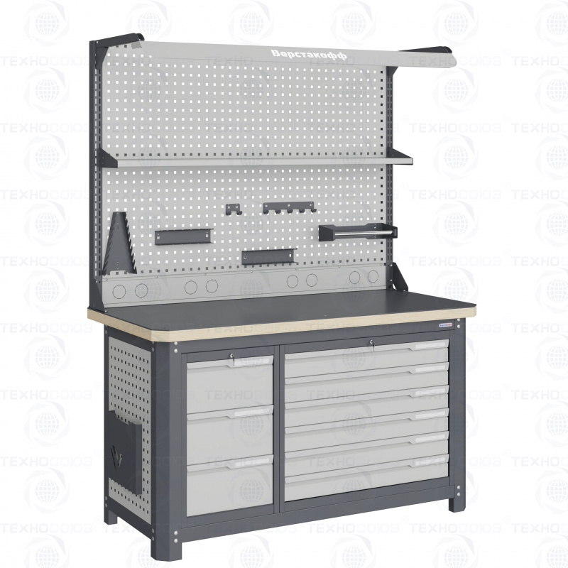 Нагрузка на столешницу 1500 кг. Столешница из листа влагостойкой фанеры марки ФСФ толщиной 40 мм. Рама верстака выполнена их холоднокатаной стали. Модуль верстака выполнен сварными. Ящики в модулях устанавливаются на шариковых телескопических направляющих полного выдвижения. Квадратная перфорация для установки крючков, держателей. В комплекте: столешница шириной 1493 мм, рама верстака, состоящей из опор, перемычек, боковых перфопанелей, малого модуля S3, большого модуля L6, двойного экрана с кронштейнами, комплекта освещения и блока коммуникаций. Размеры: 1982x1493x743 мм.