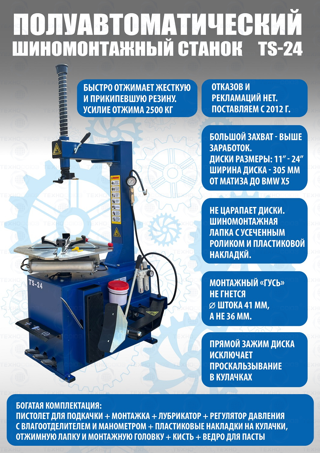 Шиномонтажного станка TS-24. Полуавтоматический. Квадратный стол. Рекомендуется для постов со средней и высокой проходимостью. Для дисков: внешний 11÷21”, внутренний 12÷24”. Усилие отрыва покрышки 2700 кг. В комплекте: пистолет для подкачки шин + монтажка + пластиковые накладки на зажимные кулачки + регулятор давления с влагоотделителем и манометром. Напряжение шиномонтажных станков 220В или 380В на выбор.