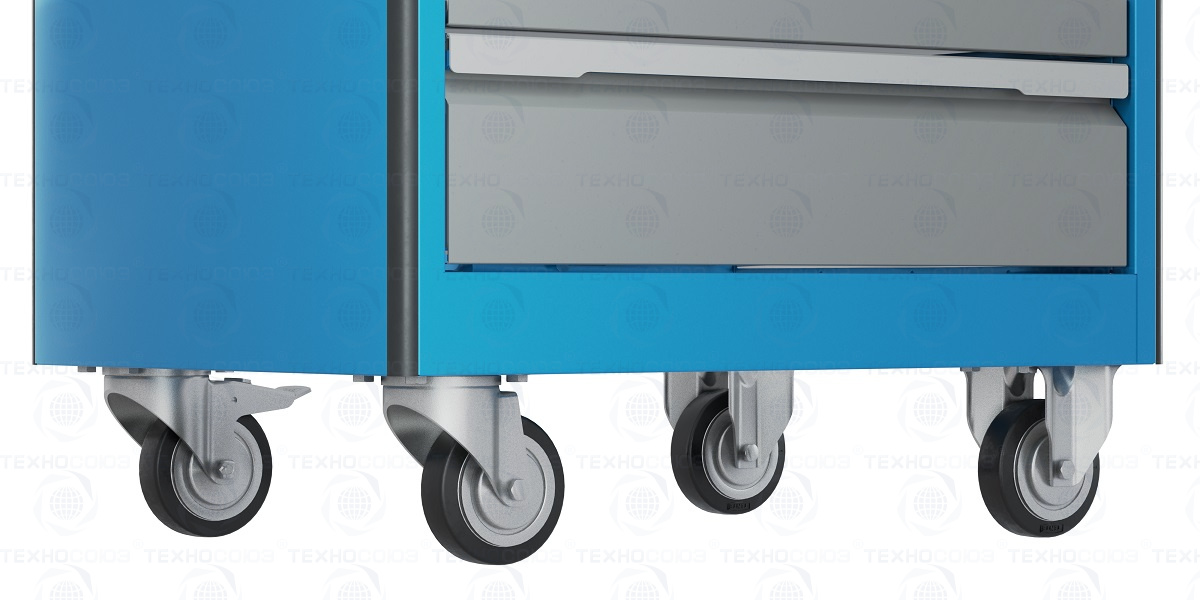 Все металлические элементы тележки покрыты полиэфирной порошковой краской, обеспечивающей хорошую износостойкость покрытия и стойкость его к моющим средствам и смазочным веществам. Цвет и текстура покрытия корпуса тележки RAL 5015, полуматовое. Цвет и текстура покрытия ящиков тележки RAL 7037, глянцевое. Цвет и текстура покрытия накладок на ящики RAL 9006, глянцевое.  На крыше тележки установлен формованный лоток, выполненный из АБС-пластика толщиной 2 мм. В лотке имеется одно большое основное отделение и три малых отделения для хранения метизов и небольшого инструмента.  Тележка снабжена центральным замком с поворотом ригеля 180 градусов, который закрывает одновременно все ящики. Замок неподвижно и прочно закреплен на корпусе тележки. В комплекте имеется два ключа. Тяга замка подпружинена.  Габаритные размеры тележки с учетом колес, лотка и ручки (ВхШхГ), не более: 950 х 780 х 490 мм (при расположении поворотных колес вдоль тележки со стороны ручки).