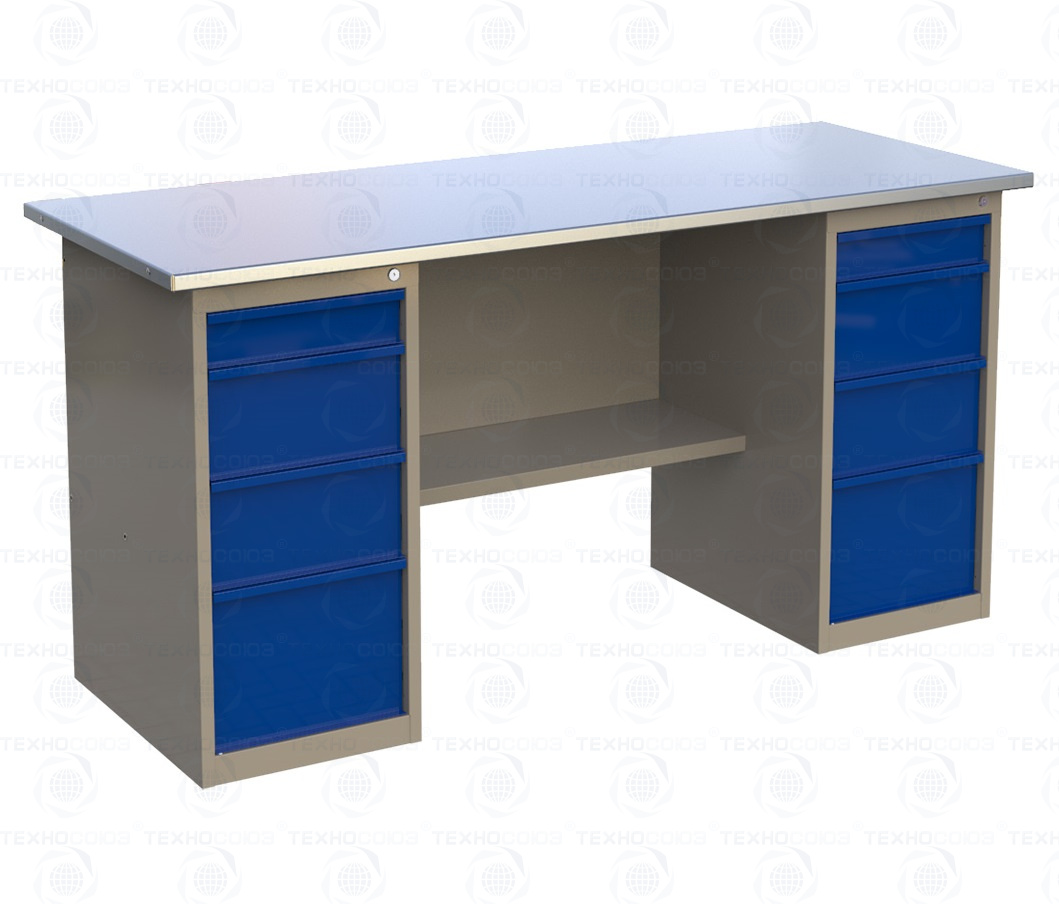 Верстак двухтумбовый поставляется в разобранном виде (4 элемента). Нагрузка на столешницу до 600 кг. Стандартный цвет: корпус - серый глянец RAL 7030, ящики и двери тумб - синий RAL 5017. Размеры:855x1800x700 мм. Масса: 117 кг.