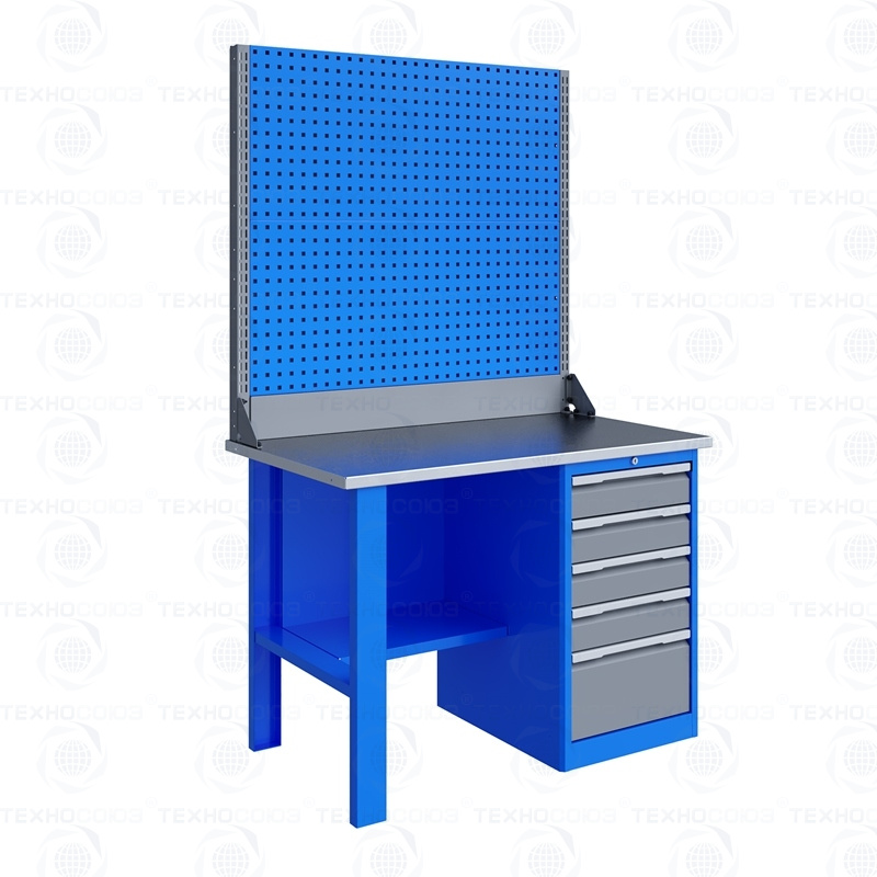 Однотумбовый. Допустимая нагрузка на столешницу 750 кг. Опорные элементы выполнены сварными из холоднокатаной стали. Для выполнения сборочных, ремонтных, слесарных, монтажных и других видов работ на производстве, в сервисных центрах, мастерских, гаражах, а также для обучения технологии в учебных заведениях. Комплектуется полкой-стенкой, расположенной под столешницей для удобного размещения габаритного инструмента и оснастки. Размеры верстака: 855x1196x696 мм. Вес: 77 кг. Поставляется в 4 комплектациях на выбор.